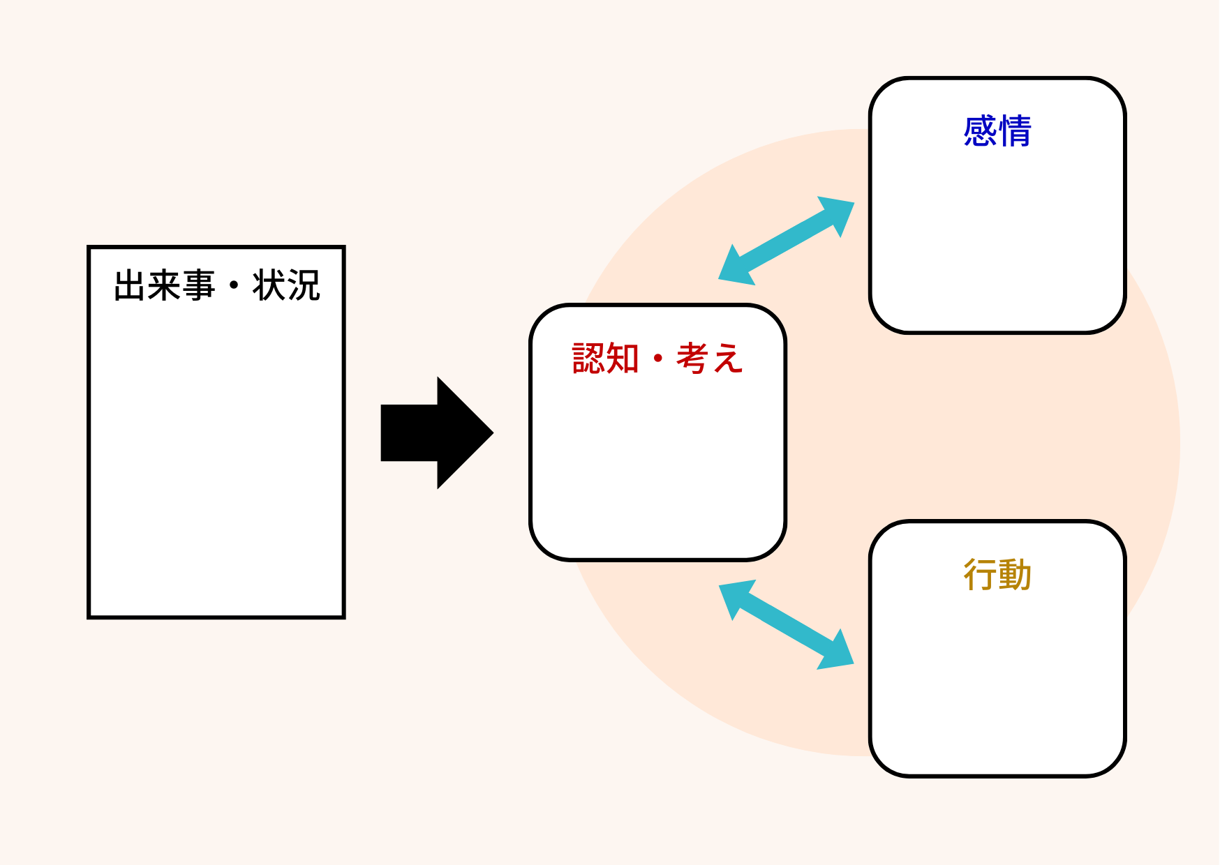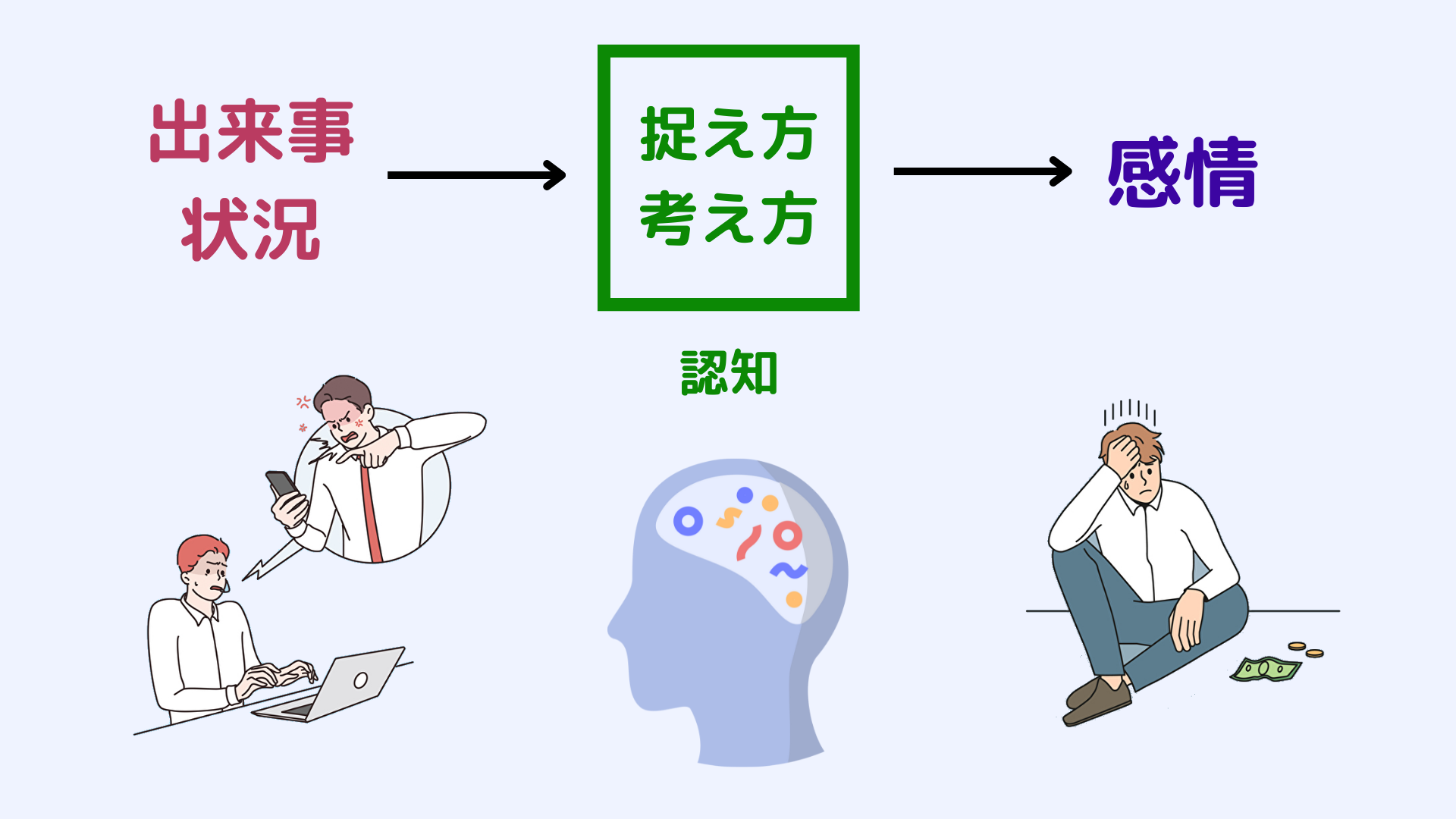 上記の図を見るとわかると思いますが、状況や出来事が直接感情を呼び起こすのではなく、その状況や出来事を”なんらかの形で認知(=解釈)”しているからこそ、感情が生まれるのです。