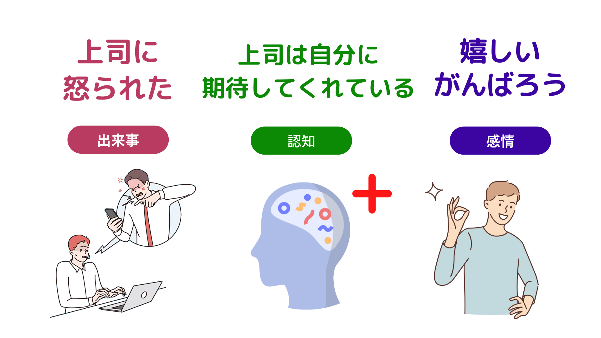 2枚目の画像では、怒られたという状況に対して”上司は自分に期待してくれている”という認知をした結果、『嬉しい・がんばろう』という感情が発生しています。