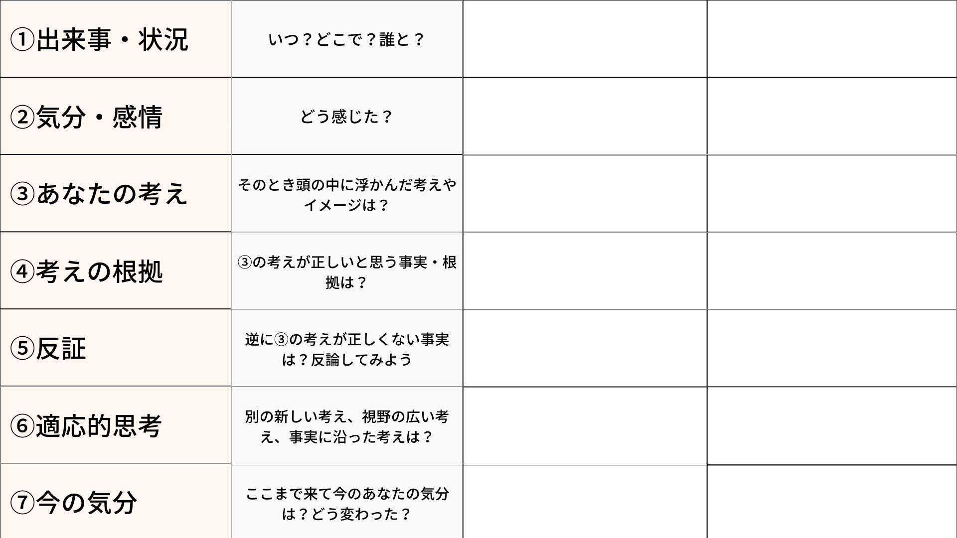自分の考えの癖に対して、『その考えが正しいという根拠』『その考えが正しくない根拠』『新しい考え方』を考えていきます。