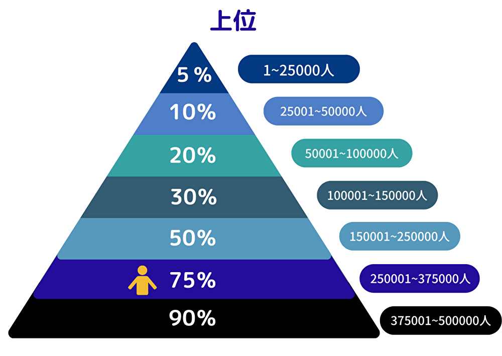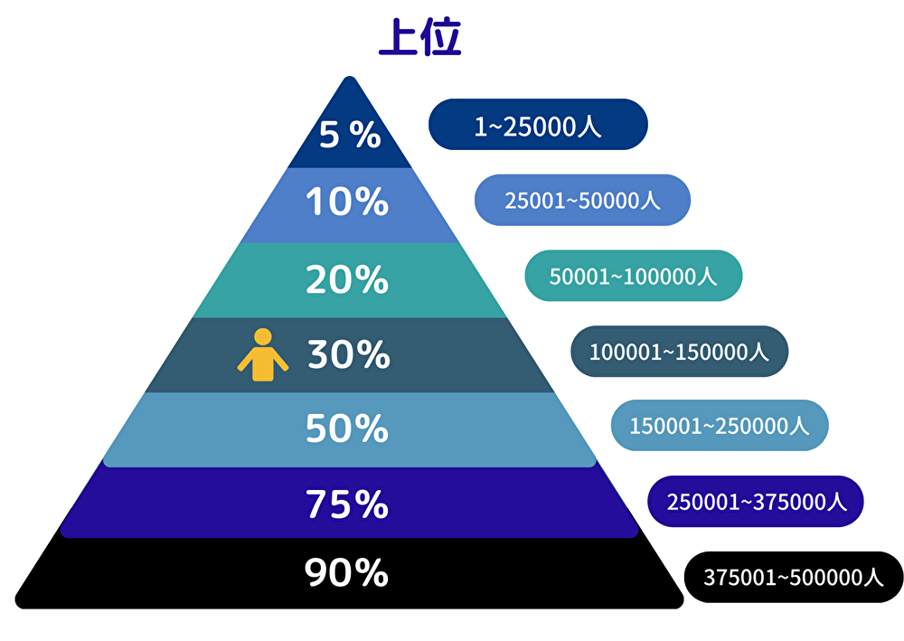 あなたの『悪い部分だけを見てしまう』歪みレベルは上位90%程度(37万5000~50万位以内 / 50万人中)で、平均よりかなり低いレベルです。