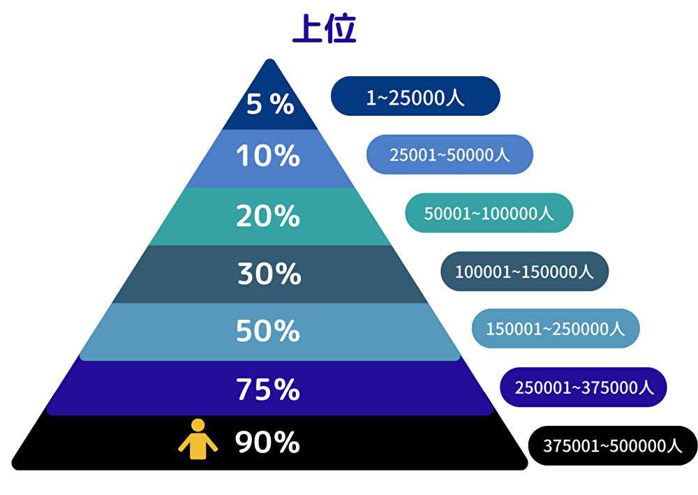 あなたの『過度な自分への期待』の歪みレベルは上位90%程度(37万5000~50万位以内 / 50万人中)で、平均よりかなり低いレベルです。